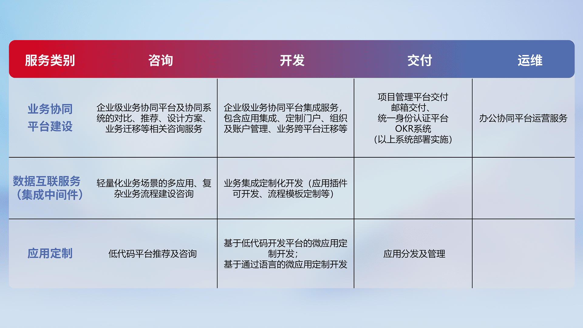 针对钉钉、、、、企微、、IDaas等平台级产品提供产品的规划、、方案、、、交付、、、定制化开发等服务,,,,实现如统一协同办公、、智能客户服务、、、、混合会议管理、、、智能数据查询、、、等业务场景,,,实现数字化转型。。。